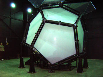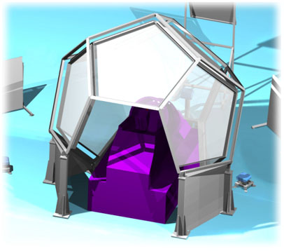 Equipe's range of rear projected G-Series display systems includes the dodecahedron form of pentagon facets known as the G3 or GeoDesic Display. This is designed for fast-jet cockpits where a very large Field-of-Regard (FOR) is required. FOR coverage is variable according to the number of facets used. Up to 10 fixed panels can be selected for very large fields of view of 360° horizontal in the upper region above 20° elevation and 300° on the horizon. Total Field-of-View (FOV) from a fixed viewpoint is achievable for most fast-jet cockpits by using an additional removable panel at the rear to allow access. Two examples of typical FOV are shown below using eight and ten projector configurations.