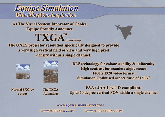 Equipe offer sincere congratulations to our partners AXIS Simulation for obtaining JAA Level D certification on their latest full flight simulator. Utilising our C-Series collimated display, G-10 IG, ProMap and Contour projectors the success of AXIS underlines Equipe's DLP based collimated visual displays as the premier solution for high fidelity professional simulation.