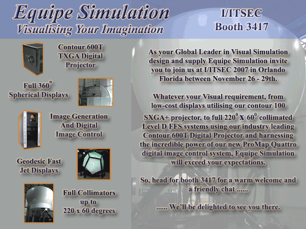 At I/ITSEC 07 Equipe were proud to demonstrate the brightest and most resolute multi-channel display at the show, providing 100 foot lamberts at <2 arc minutes per pixel and demonstrating once again Equipe's ability to design and manufacture leading edge visual solutions. Also on display for the first time was our leading edge digital projector, the Contour 600, providing TXGA resolution and underpinning Equipe as the visual solution provider of choice for all simulation applications.